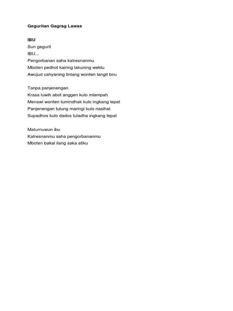 129 Geguritan yaiku golongane sastra kang edi puisi cengkok anyar wedharing rasa edi kalair basa kang laras runtut karo edining rasa nanging ora usah kecancang ing pathokan-pathokan wilangan dhong. Review Geguritan Gagrak Lawas lan Kuna DRAFT. Jadi secara sederhana Geguritan itu puisi berbahasa jawa.