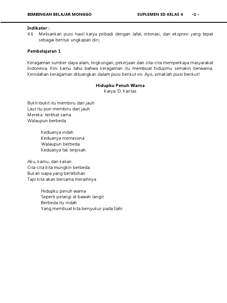 3 6 menggali isi dan amanat puisi yang disajikan secara lisan dan tulis dengan tujuan untuk kesenangan. Keduanya indah keduanya memesona walaupun berbeda keduanya tak terpisah. Hidupku penuh warna karya.