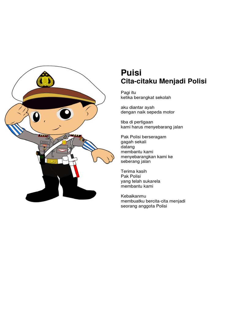 Puisi cita citaku jadi polisi. Puisi Cita-citaku Menjadi Pemain Bola Oleh. This story is written by Vik one of the kids at the Taman Bacaan Pelangi Rainbow Reading Gardens in Roe Village Flores during one of our activities Writing Competition. Aku ingin seperti ayah Jadi polisi yang membanggakan Selalu membantu dan menolong Tidak takut pada apapun.