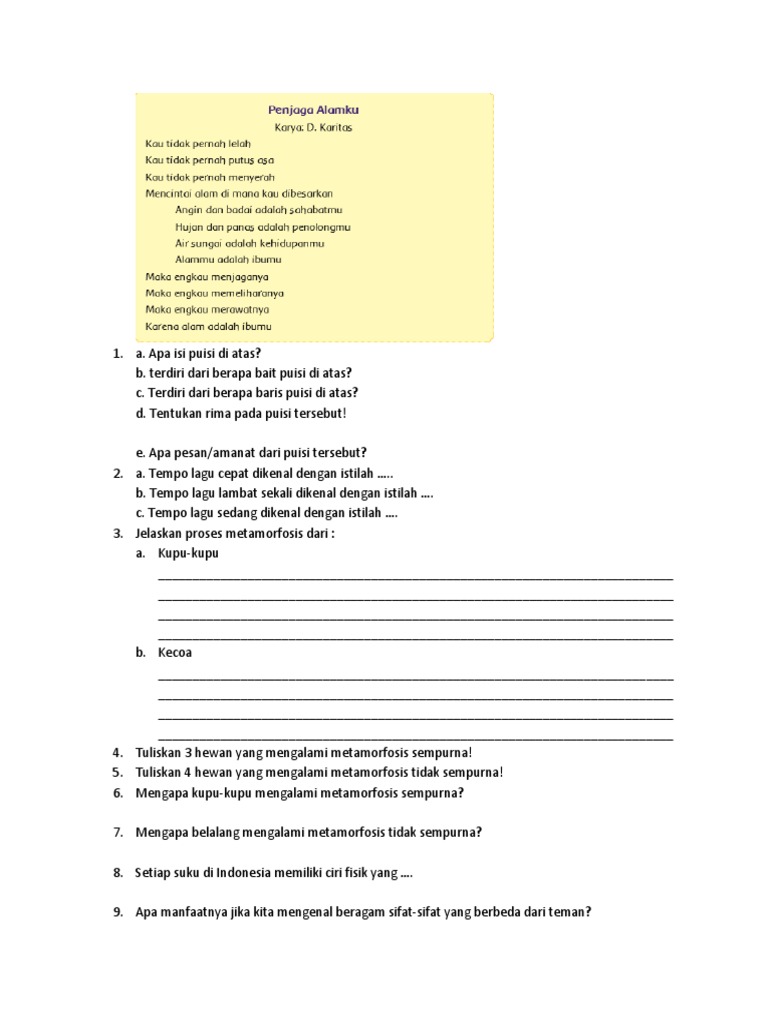 Berikut kunci jawaban tema 6 kelas 4 sd atau mi buku tematik subtema 1 pembelajaran 5 kurikulum 2013 edisi revisi 2017 halaman 49 dan halaman 50. Bait 2 kulihat ada kupu kupu terbang riang di taman bungaku warna indah pada sayapnya ia hinggap di bunga bunga. Kumpulan contoh puisi tentang lingkungan sekolah 3 4 bait singkat dan panjang.
